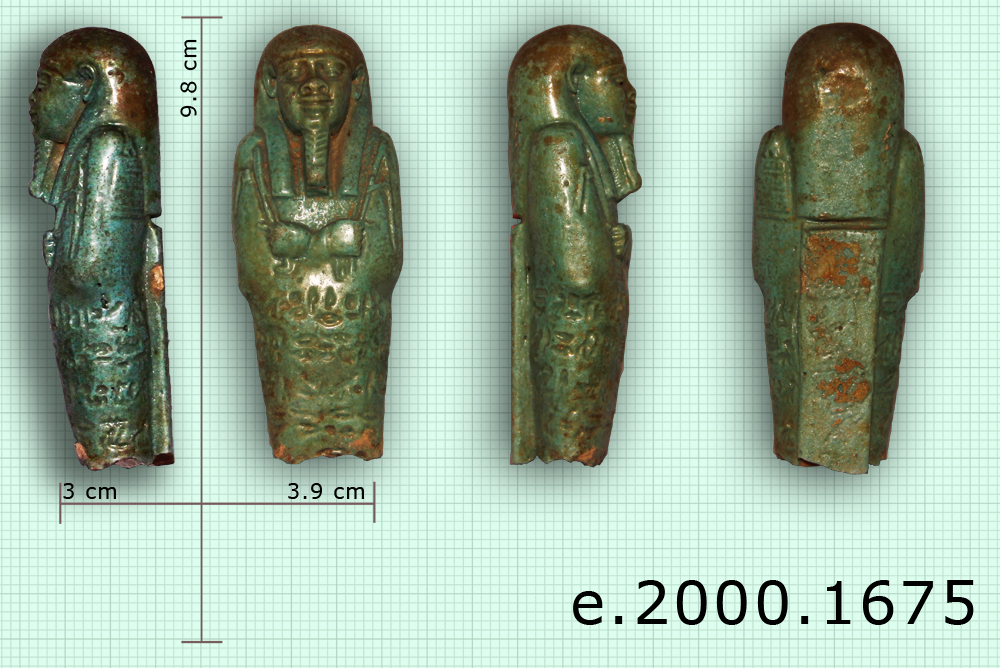 Oushebti moulé, fait de pâte de faïence avec glaçure usée bleue dans l'ensemble et noire pour la coiffure. Il a une pose momiforme, mains croisées sur la poitrine, porte une perruque tripartite peinte en noir et un collier. Le corps penche légèrement vers la gauche. Un sac de grain, caractéristique de la IIIe Période Intermédiaire est fixé sur son dos. Les yeux, le nez et les oreilles sont incisés.